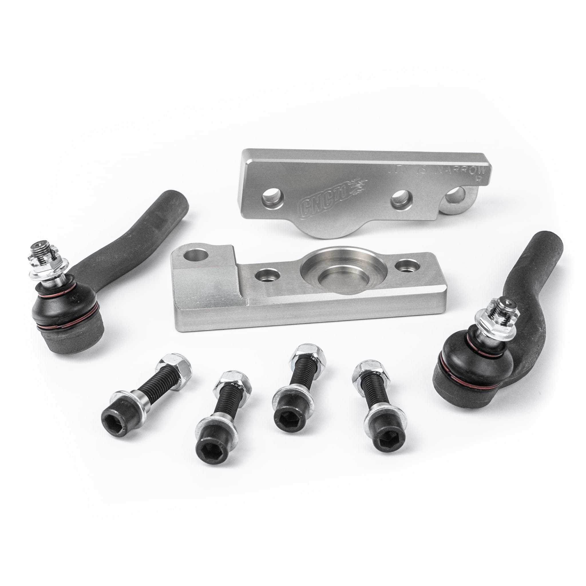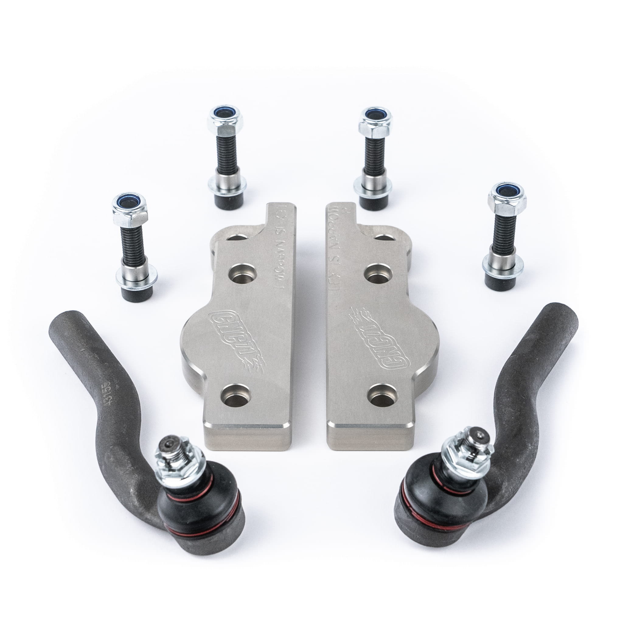 Adaptery frezowane są na maszynach CNC, co daje wysoką jakość wykończenia i 100% dopasowania adaptera do zwrotnicy i do sworznia wahacza. Zastosowany stop aluminium gwarantuje wytrzymałość większą niż seryjnego rozwiązania. Adaptery są pokryte powłoką anodową.